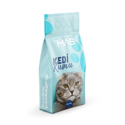 Kedi kumları ağır malzemeler olduğundan, yüksek mukavemetli, delinmeye ve yırtılmaya karşı dirençli çok katmanlı film yapılarında tutulmalıdır. Aynı zamanda nemi emerek kedi kumunun topaklanmasını önlemek için nem bariyer özelliği olan esnek ambalaj malzemelerinde korunmalıdır. Kedi kumları 3 litreden 20 litreye kadar geniş bir yelpazede paketlenir ve özellikle yüksek hacimli ürünler için PET+PE yapıları tercih edilir.